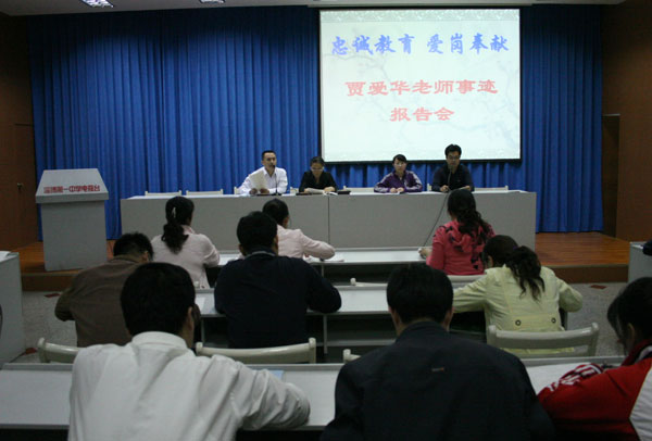 2008年9月24日晚7点20,“忠诚教育,爱岗奉献——贾爱华老师报告会”在科技报告厅隆重举行,报告会由团委副书记曹勇老师主持,共有114名老师与会。