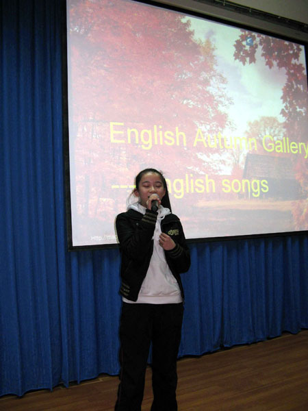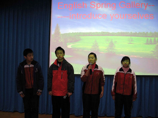 比赛分为四个环节:“英语之春---自我介绍”、“英语之夏---看图说话”、“英语之秋---英文金曲”、“英语之冬---佳篇诵读”。每个班派出四名同学代表本班参赛。富有创意的同学们将简单的自我介绍赋予了一定的场景,令人耳目一新。现场抽题的看图说话显示了同学们丰富的想象力与现场组织语言的能力。曲曲动感的英文金曲更是花季男女同学的强项,动听的旋律,优美的舞姿尽展少年的活力。对英文名篇的配乐朗诵让我们领略了外国文学的魅力,激昂的《I have a dream》,伤感的英文版《再别康桥》,朗诵者们标准的语音语调与纯净悠扬的经典钢琴曲完美地揉和在一起,让在场的评委老师和同学们不禁为之动容。