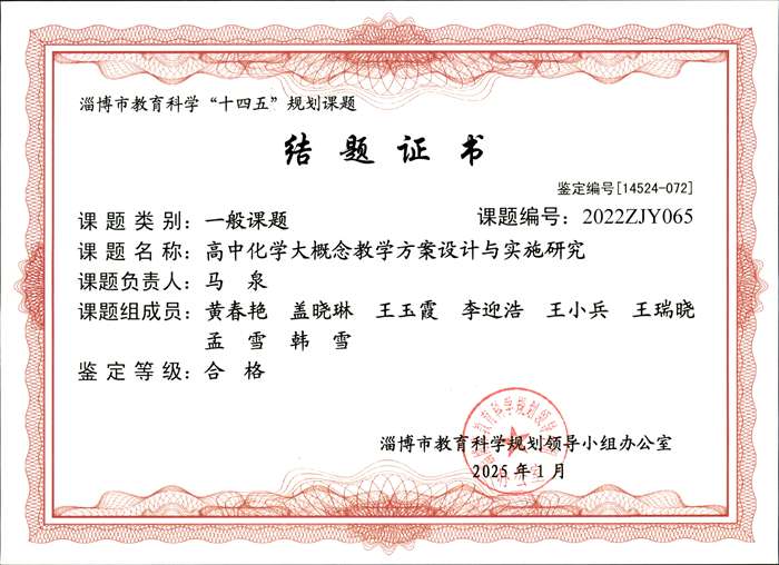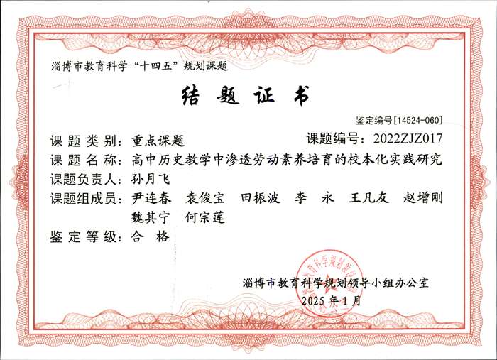 樊恒明老师主持的课题《基于量化分析的高中增值性评价模型构建与实践研究》顺利通过2024年度山东省教育教学研究课题评审,确定立项;魏其宁老师主持的《新时代高中生德育评价体系构建与实践研究》、王小玲老师主持的《基于计算思维培养的高中信息技术大单元项目式教学模式研究》、胡丽丽老师主持的《核心素养视域下高中微生物实验的创新性研究》、班云霞老师主持的《主题语境下的高中英语阅读资源整合式教学探究》四项课题顺利通过博山区教育科学“十四五”规划2024年度课题评审,确定立项。