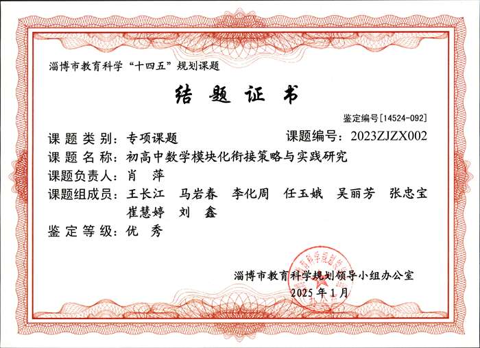 在淄博市教育科学“十四五”规划课题结题评审中,孙月飞、马泉、肖萍三位教师主持的三项课题顺利通过专家评审并圆满结题,其中肖萍老师主持的拔尖创新人才贯通培养专项课题《初高中数学模块化衔接策略与实践研究》获优秀等次。