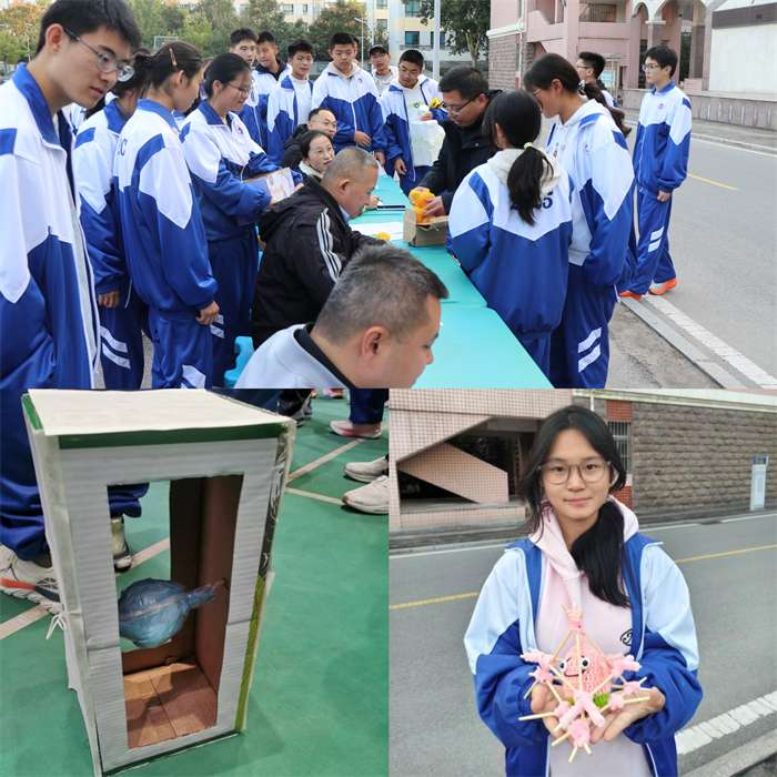 “鸡蛋撞地球”竞赛则是一场力学智慧的盛宴。各参赛团队巧思迸发,运用缓冲减震与减速降速原理,利用泡沫、纸盒、气球等日常材料构筑了各式各样的“安全舱”:有的团队串联气球,仿造出高效的降落伞减速系统;有的则用海绵和软布设计出多层缓冲结构,为鸡蛋筑牢“防线”。每当鸡蛋完好无损地平稳着陆,现场便爆发出热烈喝彩;即便偶有“壮烈牺牲”的案例,这些“遗憾瞬间”也成为了同学们复盘反思、积累实战经验的宝贵一课。