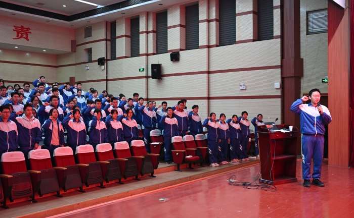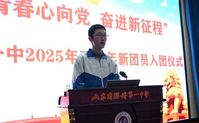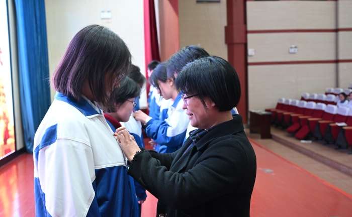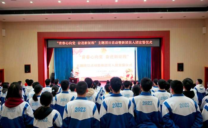 仪式在庄严的国歌声中拉开帷幕。校团委赵金明老师宣读新团员名单,张蕊副校长与老团员代表共同为新团员颁发并佩戴团徽。在优秀团员代表于文恒同学的领誓下,全体新团员面向团旗,高举右拳,庄严宣誓。誓言铿锵,彰显了他们坚定理想信念、永远跟党走的决心。高三22班李金研同学代表新团员发言,分享了对团员身份的深刻认识,承诺将以更高标准要求自己,勤奋学习、服务集体、发挥先锋模范作用。