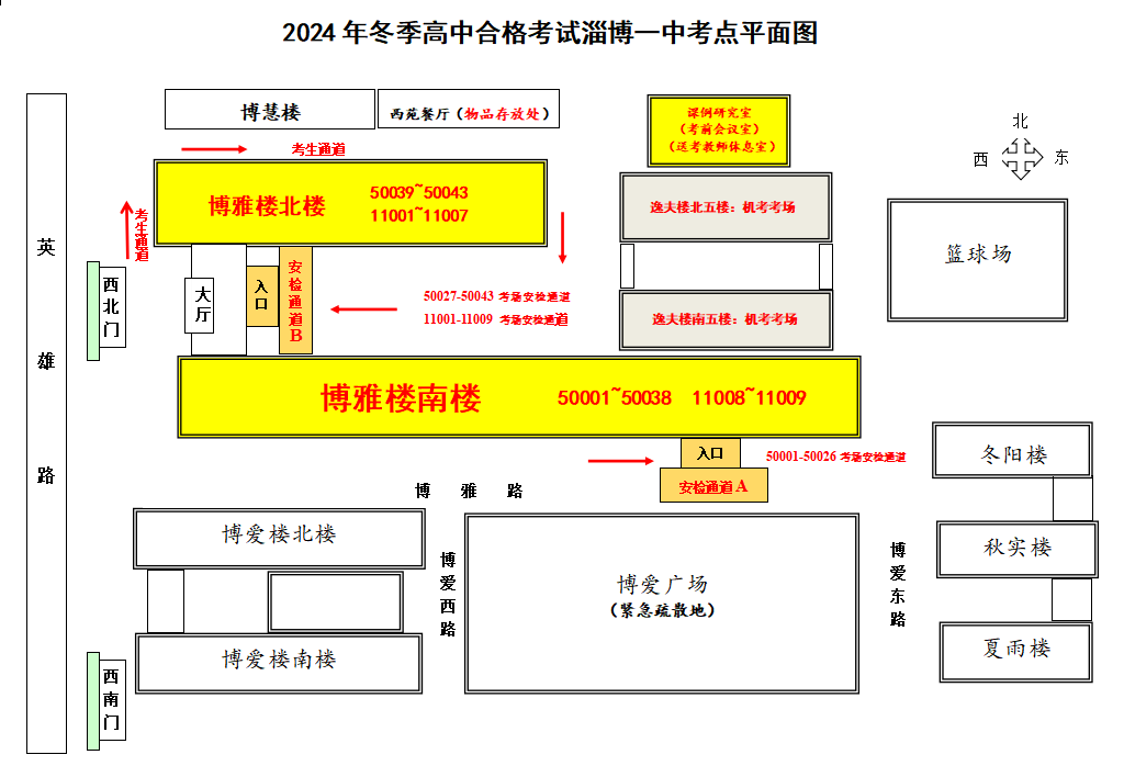机考考生由淄博一中西门进入,进校门后左拐,根据指示牌先将与考试无关的个人物品放至西苑餐厅内的物品存放处;沿西苑餐厅门前的路到达安检通道B(路中段右边小广场)进行安检。