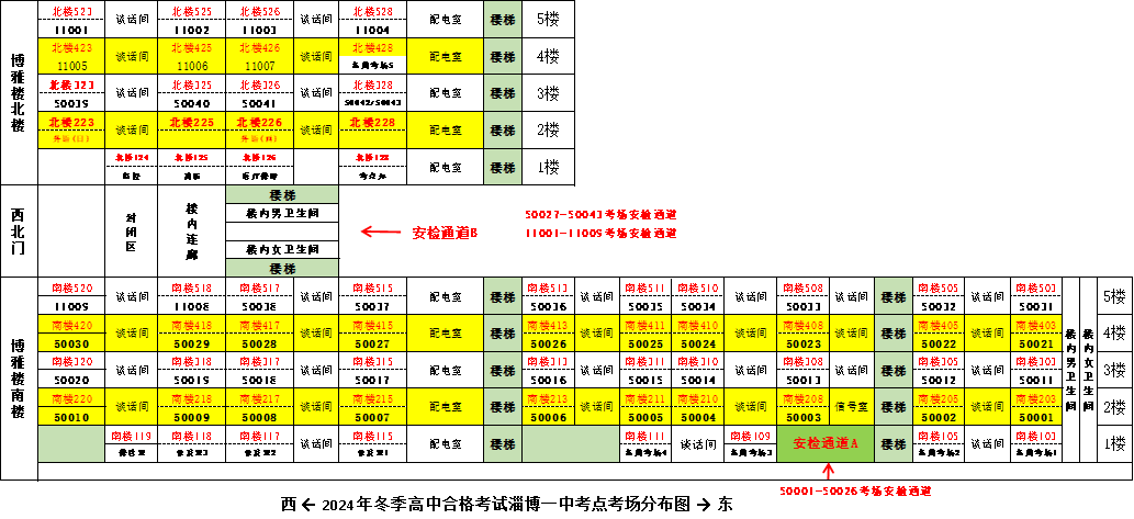 文化课考生由淄博一中西门进入,进校门后左拐,根据指示牌先将与考试无关的个人物品放至西苑餐厅内的物品存放处;沿西苑餐厅门前的路可以分别到达安检通道B(路中段右边小广场)和安检通道A(博爱广场路口左拐)。