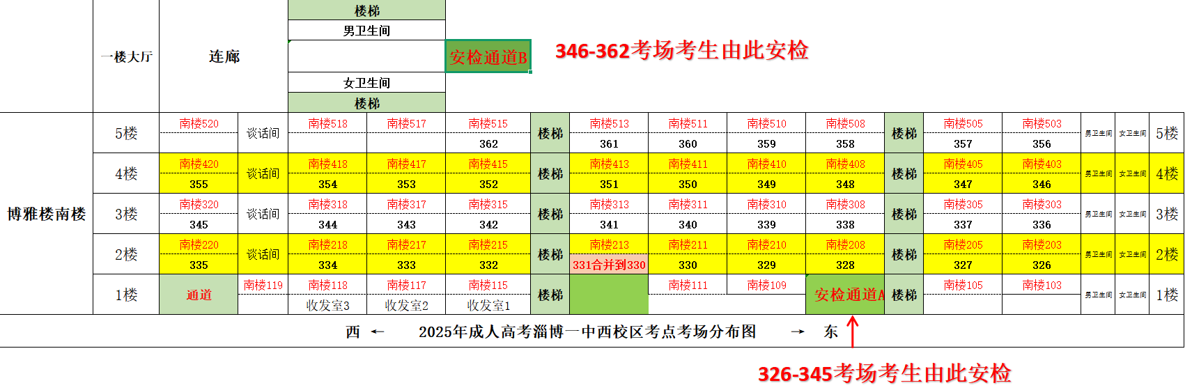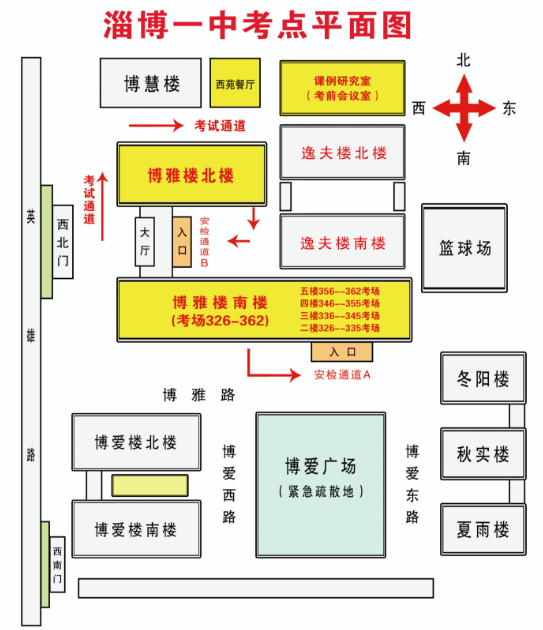 考生由淄博一中西北门(英雄路34号)验证(身份证、准考证)后进入,行至博雅楼A、B通道有序排队,间隔一米进行安检、智能安检门、人脸识别安检后,方可进入博雅楼前往各考场。326-345考场由安检通道A进入,346-362考场由安检通道B进入离考场较近。