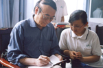 题词:悠悠寸草心,难报三春晖。感谢亲爱的母校。学生张宏森。(图中右为张宏森)
