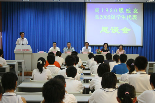 随后,在学校学术报告厅举行了高1980级校友与高2005级学生代表恳谈会。中国空军航空大学飞行学院某训练团团长孙兆福,淄博市“十大”杰出青年朱晓虹,区公安局政治处副主任马德恩,山东鲁耐窑业有限责任公司董事、财务处长许守红等校友与近百名学生代表进行了互动交流。