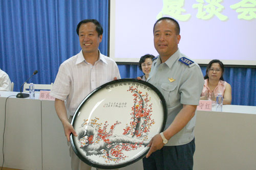恳谈会前,孙兆福校友向母校赠送了纪念飞机模型,陈贞凯校长向他回赠了纪念刻盘。(任明忠)