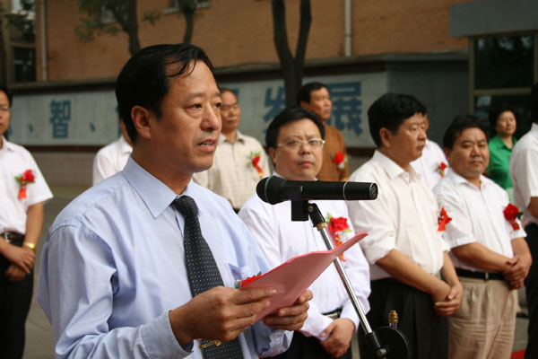 陈校长在致词中,首先代表校党委、行政和全校师生对各位领导、各位嘉宾的到来表示热烈的欢迎,对各位领导、各位嘉宾在学校发展中给予的热情关心和大力支持表示诚挚的感谢。他说,上学年,学校上下秉承深厚的文化积淀和优良的治学传统,以“为全体学生发展负责,为学生全面发展负责,为学生未来发展负责”的现代教育理念为指导,着力实施“质量立校、人才强校、科研兴校、文化塑校”四大战略,发扬“严谨、求实、团结、进取”的一中精神,开拓创新,扎实工作,学校的各方面工作都取有新的突破。一是教育教学质量再创新高:2006年高考本科录取再超千人;应届文理本科一、二批上线率居全市第一。学校一举捧得淄博市2006年普通高考十强学校第一名、淄博市“十五”期间普通高中名校、2005—2006学年度淄博市普通高中教学工作先进学校三项殊荣,继去年我市首次对高考进行综合排名勇夺第一之后,再次名列全市十强学校首位。外语学校初2002级中考成绩喜人:蒋楠同学以667分勇夺全市第二名;进入全区前20名5人、前100名19人;达到重点中学计划内录取人数超过130人,升学率列全区第一,荣获博山区中考突出贡献奖。二是队伍建设日趋优化:学校始终把提高教师队伍素质作为战略任务来抓,在大力强化教师业务水平的同时,以爱岗敬业、关爱学生、无私奉献作为师德建设的核心,突出教师职业道德建设,坚持“有作为就有地位”的评价原则,营造“发展在一中、创业在一中、幸福在一中”的文化氛围。今年有31名教师被授予淄博市2006年高考突出贡献奖、优秀备课组长和优秀班主任,8名同志荣获市局党委优秀共产党员称号,学校还隆重表彰了优秀教师、优秀教育工作者、师德标兵、学科带头人、优秀青年教职工、优秀教工团员、青年新秀、“巾帼岗位明星”120名。三是基础设施建设发展迅猛:学校克服困难,自筹资金,自求发展,新大门如期竣工,西大门4月底启用,西校宿舍区北门改造、南大门道路扩建工作顺利完成,教职工宿舍新区建设稳步推进,两幢基本竣工、四幢破土动工,新办公大楼和西校区学生餐厅规划完成,不日即将开工建设。全部为高三教室安装了空调,学生公寓安装了电扇,部分年级更换了新课桌凳。改善了办学环境和生活环境,为全面提高教育教学质量提供了有利保障。四是国际教育交流与合作实现新突破:4名同学代表我市参加了中日政府高中生短期(12天)访问;1名同学入选教育部与日本国际交流基金会中国高中生为期一年的长期访问团;中外联程班共有78名同学分赴英国、日本、韩国深造。正在英国就读的前两届中英联程班的40名学生已被英国大学录取,开始攻读学士学位,其中有10名被在英国排名前十位的帝国理工大学、巴斯大学、华威大学、约克大学、诺丁汉大学录取。五是学校文化亮点迭出:“校友母校行”活动有序开展,高一级校友的“五十年情怀”在全市引起巨大反响,央视著名主持人、“功勋校友”曲向东和著名歌唱家、“功勋校友”曹连生相继回访母校,高80级校友捐建的“士子园”举行落成剪彩仪式;校园电视台正式开播;与山区中学“手拉手、同发展”联谊活动向纵深发展,学校在给予他们一定物质援助的同时,站在推动区域教育整体发展的高度,发挥重点学校的辐射带动作用,把一些较为成功的办学理念和管理思想传播开去。