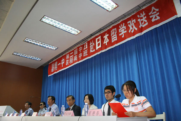 陈贞凯校长发表讲话,他讲述了我校与日本关西语言学院的合作历程,对奋战在第一线的老师们表示了深深的谢意,对松尾校长一贯的支持表示了衷心的感谢,对即将远行的学生们表达了诚挚的祝愿,对家长明智的选择和对一中的支持表示了赞许和感谢。