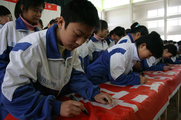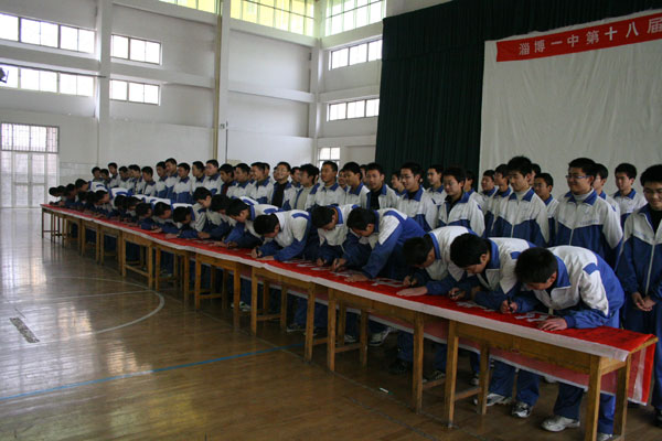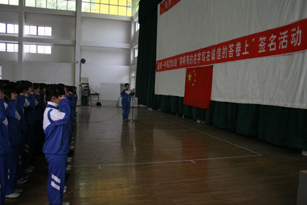 为加强学风考风建设,迎接第二次学习竞赛。12月24日,高2006级组织全体学生在学校体育馆举行了“将响亮的名字写在诚信的答卷上”签名仪式。