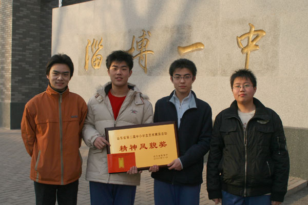 在刚刚结束的山东省第二届中小学艺术展演比赛中,由我校艺术中心管莹老师辅导,由04级音乐班薛鹏和05级音乐班王潇、赵东岳、车新天四位同学合作录制的男生四重唱《阿拉木汗》MTV,在山东省第二届中小学生艺术展演中荣获二等奖,同时获精神风貌奖,管莹老师获优秀指导教师。这是由淄博市体委艺科通过全市选拔,推荐代表淄博市的参赛节目,对于本次比赛的结果,市体委艺科领导给予了充分肯定。