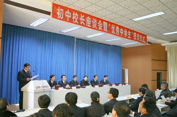 1月3日,博山区初中校长座谈会暨淄博一中2006年度"优秀中学生奖学金"颁奖仪式在我校科技报告厅举行。参加本次大会的有各初中学校校长及获奖学生、区教育局领导、我校领导班子成员及部分名师代表,副校长高雪长主持了会议。