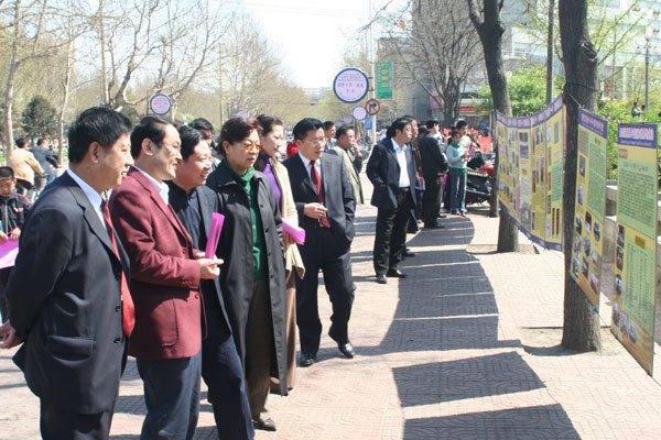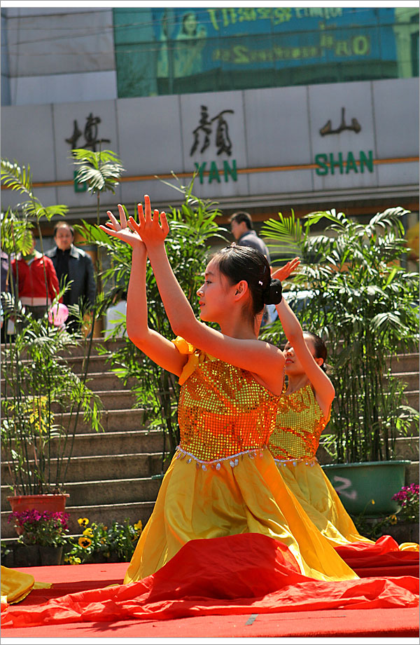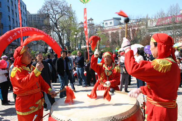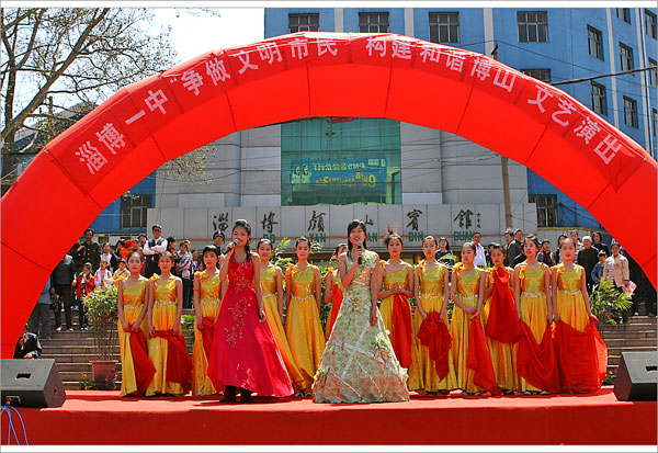 文艺演出于10时拉开帷幕,淄博一中艺术团的师生载歌载舞,向广大市民献上了一台异彩纷呈的节目。群舞《溜溜的康定溜溜的情》舒展出了西域高原的柔美,古筝独奏《春到湘江》浸润出了南国山水的优雅,女声三重唱《欢天喜地》抒发出了共奔小康的豪情。外籍教师教唱英文歌,武术队员挥舞刀枪剑戟,优秀校友倾情献歌。一曲曲“心歌”,一节节“心舞”,不时赢来场内观众的阵阵掌声。最后一曲《和谐中国》,更是大气磅礴,催人奋进,将宣传活动推向高潮。