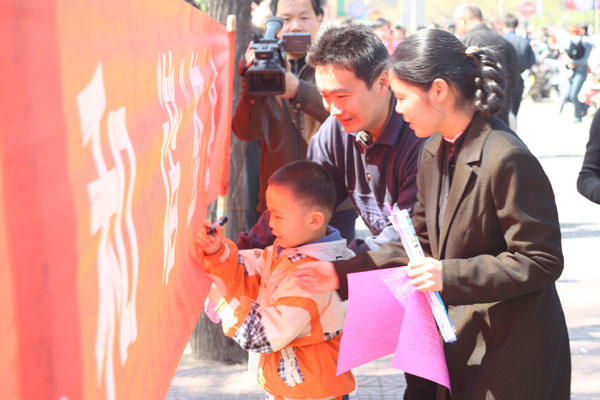 上午9时,广场上锣鼓声声,彩旗猎猎,人山人海,将“淄博一中‘争做文明市民、构建和谐博山’文艺演出”的大型彩门和“尽职尽责办好学校、全心全意培育人才”的竖幅标语映衬得更加红红火火,鼓舞人心。着装整齐的教师和同学把一张张倡议书散发到人们手中,年过古稀的长者、风华正茂的青年、活泼可爱的少儿纷纷在“争做文明市民、构建和谐博山”条幅上庄重地签下了自己的名字,“从我做起,从现在做起,从小事做起,争做文明市民,做和谐博山的先行者、建设者、传播者、监督者,手拉手谱写辉煌的乐章”成为博山人共同的心声。