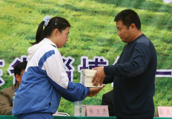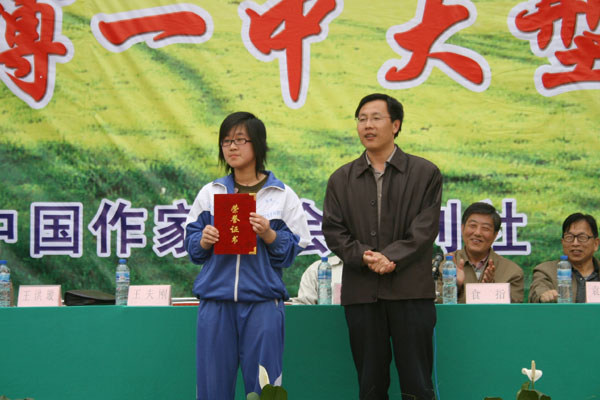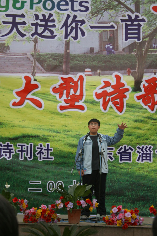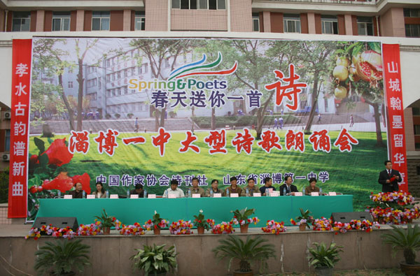 开幕式上,首先由陈贞凯校长致词,代表学校对各位来宾和领导的光临表示欢迎,对中国《诗刊》杂志社“春天送你一首诗”大型诗歌朗诵会在我校召开表示祝贺,并衷心希望诗歌朗诵会取得圆满成功。中国作家协会诗刊社、著名诗人蓝野为淄博一中颁发2007山东省诗意校园奖牌,他在讲话中对淄博一中深厚的文化底蕴和优良的传统承继给予高度褒奖,倡议全体学生做一个拥有纯净心灵的诗人,享受春天的阳光,接受诗歌的滋润,用美妙的诗歌表达内心欢快的感言,让生命拥有一抹鲜艳的绿色。扬子江诗刊副主编子川为淄博一中洗凡文学社颁发了山东省高中校园优秀文学社团奖牌。著名诗人王夫刚为淄博一中高2006级25班孙文颖同学颁发了山东省高中校园优秀文学作品奖证书。著名诗人孙方杰向淄博一中广大诗歌爱好者赠送了《《山东省青年诗选》和《山东省高中文学社团优秀作品集》。