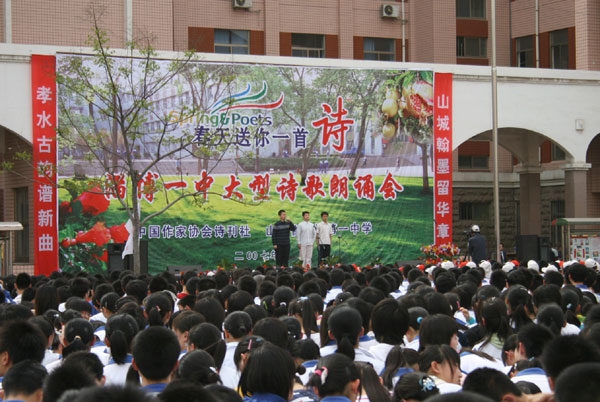 4月20日下午,“春天送你一首诗”淄博一中大型诗歌朗诵会隆重举行。著名诗人食指、王夫刚、孙方杰、蓝野、子川,山东师范大学教授、诗歌评论家袁忠岳,中国诗刊社山东联络处主任王洪璇,市教育局调研员张忠泽,市委宣传部文教科科长吕德民,共青团博山区委书记李晓燕,区委宣传部副部长程涛,区教育局纪委书记赵洪利,校长陈贞凯等在主席台就座,副校长高雪长主持开幕式,区属中小学师生代表和淄博一中师生近5000人参加朗诵会。