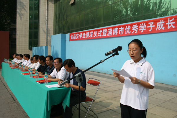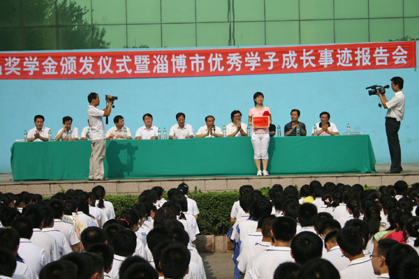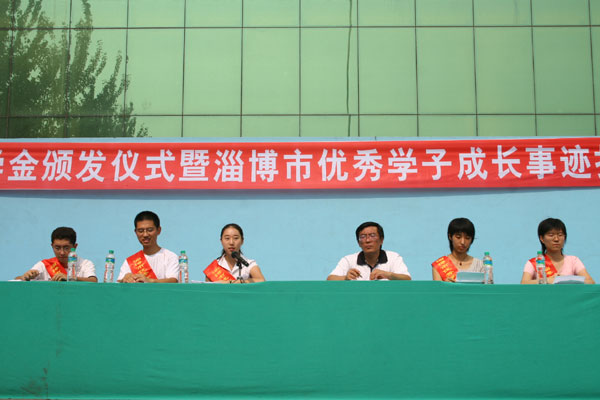 会议在庄严雄壮的《中华人民共和国国歌》声中开始。李诚校长宣读《淄博一中关于表彰周文静等六名同学的决定》,向考入清华大学的周文静、苏善诚、孙小凡、张新雨、王倩和北京大学的王媛媛6名同学颁发“淄博一中优秀学子奖学金”,以表彰他们在学习方面的引领和表率作用。