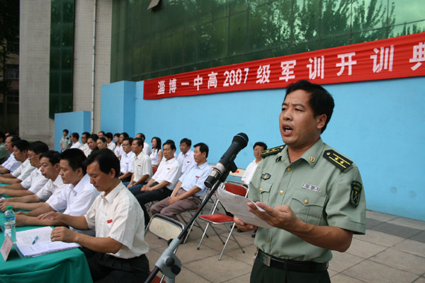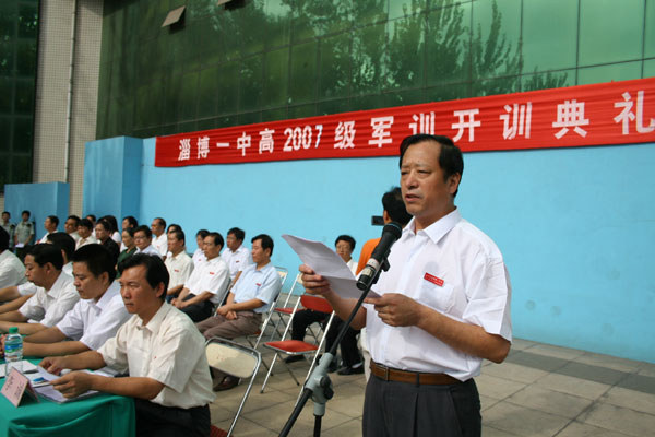 陈贞凯校长发表讲话,他首先代表全校师生向区政府、区人武部的领导和全体参训教官表示衷心的感谢,向从全省、全市各区县、各中学升入我校的1510名优秀学子表示诚挚的欢迎。他指出,我校是一所有着光荣历史和辉煌业绩的老牌名校,创建于1924年,1955年被确立为省重点中学,1992年成为山东省首批规范化学校,2006年被评定为山东省首批普通高中教学示范校,迄今已走过了83年的光辉历程。历经近一个世纪的办学实践,学校铸就了“严谨、求实、团结、进取”的一中精神,形成了艰苦奋斗、勇于改革、开拓创新的个性,树立了“发展是硬道理”的坚定信念,以“教风严、学风正、校风好、教育教学质量高”受到社会各界的广泛赞誉。教学质量在全市一路领先,是淄博市唯一的高中样板学校:高考本科上线人数先后在全市率先突破500名、700、1000名大关,保持最高记录。1993年,郑晓亮同学获25届国际化学奥林匹克竞赛银牌,实现了淄博市国际奥赛“零”的突破。1998年,赵文发夺得全省“理科状元”桂冠。自2001年以来,连续7年夺得全市高考本科上线人数第一名,其中孙婷婷、栾静、周文静同学分别荣膺03年、04年、07年全市理科状元桂冠。今年高考:本科上线录取1064人;一、二批上线人数和上线率在全市均列第一;周文静等6名同学被北大、清华录取。他强调,作为步入高中生活的第一课,军训是对学生进行国防教育、实施素质教育的一个重要形式,对激发同学们爱国热情,增强集体主义、组织纪律观念,磨练坚强意志,增进吃苦耐劳精神等方面将起到关键作用。历届受训的同学都深深体会到,军训对以后的学习、工作和成才奠定了基础。希望同学们要以饱满的热情投入训练,以勇争第一的精神状态完成训练。要虚心向教官学习,听从教官的指挥,勇于吃苦,乐于吃苦。要强化安全意识,无论是课上还是课下,安全必须放在第一位,严格杜绝伤害事故的发生。