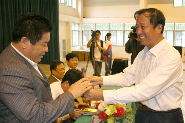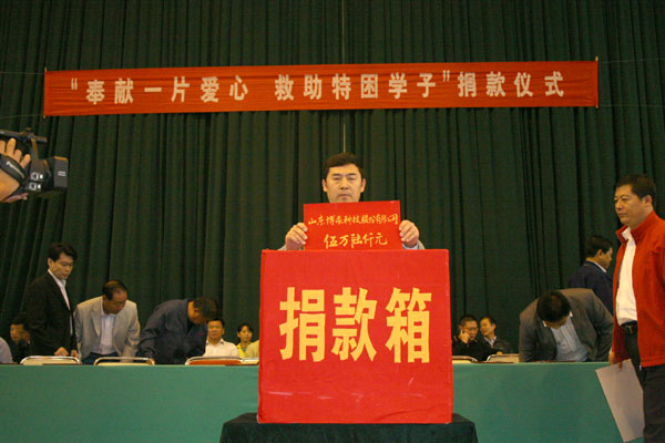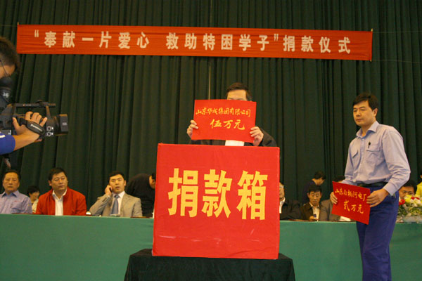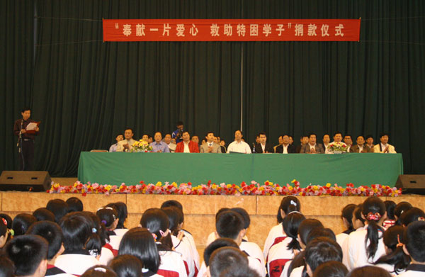 在举国上下喜迎党的十七大召开之际,我校于9月30号在校本部体育馆隆重举行“奉献一片爱心、救助特困学子”第十七次捐款仪式,学校爱心联谊会成员、领导班子成员在主席台就座,副校长张业玉讲话,工会主席孙希刚主持,3000余名师生参加。省、市、区电视台对此进行了专题采访。