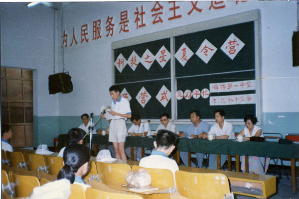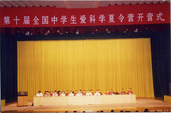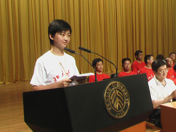 第十三届红十字夏令营恰逢北大第十届夏令营,北京大学副校长致词,反伪斗士何祚庥院士作报告,我校栾静同学代表全国2000余名营员在北大百年大讲堂发言