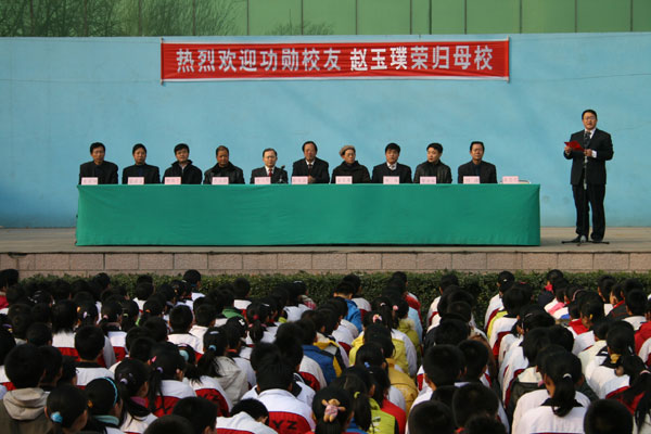 学校在校本部前操场举行了简短而热烈的师生见面会,以一种特定的方式欢迎赵玉璞校友回访母校。在主席台就座的有:陪同赵玉璞校友回访的山东大学威海分校教务处处长、硕士生导师刘海教授,山东大学威海分校信息学院院长、博士生导师赖晓平教授,山东大学威海分校人事处处长栗庆平教授,赵玉璞校友的高中班主任、全国优秀教师由辛基老师,英语教师李太源老师,学校校长陈贞凯、副校长张业玉、纪委书记刘诚、工会主席孙希刚。副校长高雪长主持仪式,4500余名师生参加。