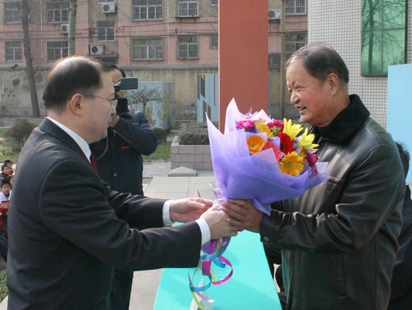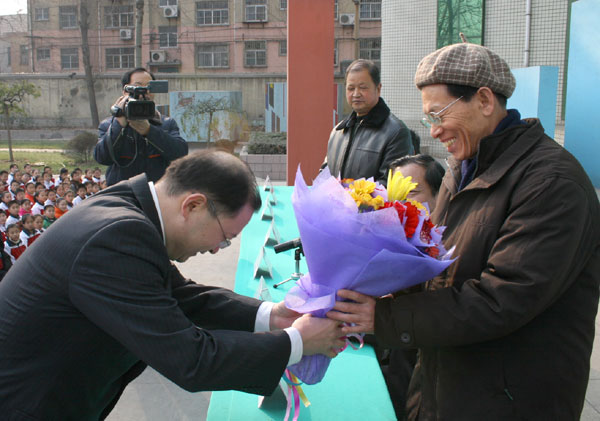 赵玉璞校友向由辛基老师、李太源老师敬献鲜花,表达了学生对老师的深深敬仰和绵绵感激。陈贞凯校长向赵玉璞校友颁发“功勋校友”荣誉杯,以表彰他以其卓越的成就为母校所带来的荣光。至此,自“校友母校行”活动开展两年来,我校已先后授予14位校友“功勋校友”称号。