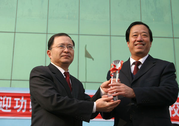 陈贞凯校长向赵玉璞校友颁发“功勋校友”荣誉杯