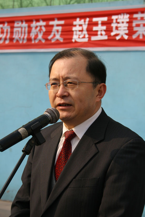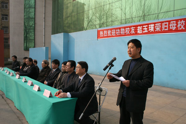 张业玉副校长致词,代表学校向荣归母校的赵玉璞校友表示热烈的欢迎,向山东大学威海分校的刘处长、赖院长、栗处长三位领导光临我校指导致以诚挚的感谢。他指出,广大校友,尤其是众多著名、知名校友的奋斗成长历程,是学校宝贵的精神财富和文化资源。我校于2005年6月开始实施“校友母校行”系列活动计划,邀请知名校友回母校访问,与师生见面,举办各种报告会、座谈会,目的在于激励在校学生,促进学校发展。