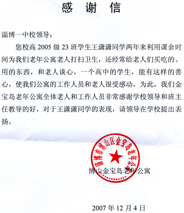 来自博山金宝岛老年公寓的感谢信