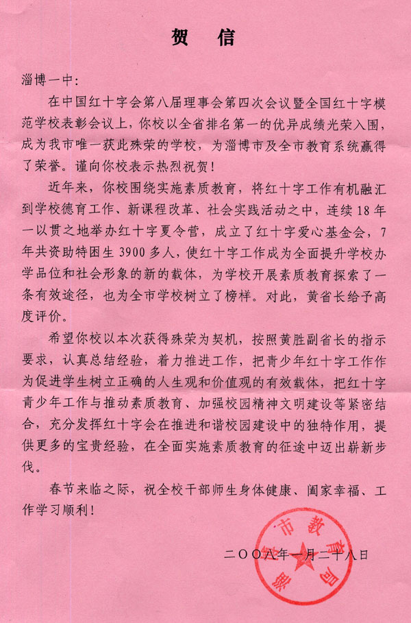 市教育局致信祝贺我校荣获全国红十字模范校称号