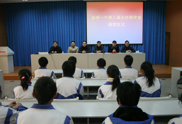 天祥奖学金是由淄博天威集团天祥公司出资设立,用于奖励每年从博山四中和博山四中分校考入淄博一中的学生,旨在鼓励他们珍惜在淄博一中学习的大好机会,不畏艰难、刻苦学习、勇于争先,争创优异成绩为家乡、为母校争光。