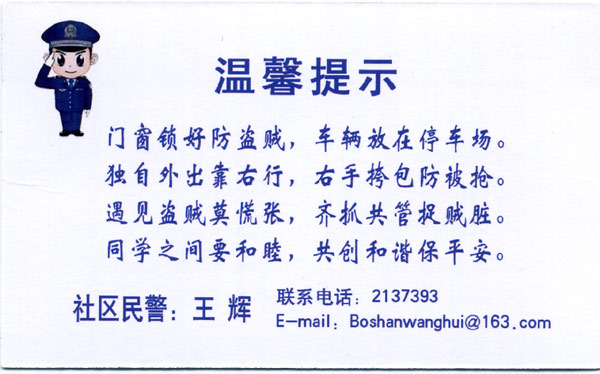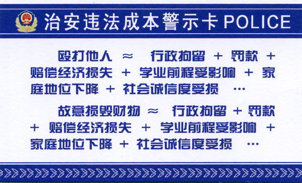 “一栏一卡” 即“社区民警宣传栏”和《治安违法成本警示卡》通过一栏一卡的形式及时向在校师生发出警示,警告其违法犯罪的后果。“一栏”对发生在学校周边及学生内部的治安案件及时整理在宣传栏内进行张贴。学生人手一警示卡,重点警示学生“殴打他人、故意损毁财物要受到行政拘留+罚款+赔偿经济损失+学业前程受影响+家庭地位下降+社会诚信度受损”等影响;就车辆防盗、背包防抢等对学生进行温馨提示。师生都表示,警示卡虽小但教育意义大,民警法制教育工作走进校园走进班级,做在了前头,这将进一步推进了青少年的法律素质教育,为保障校园安全起到了积极的推动作用。