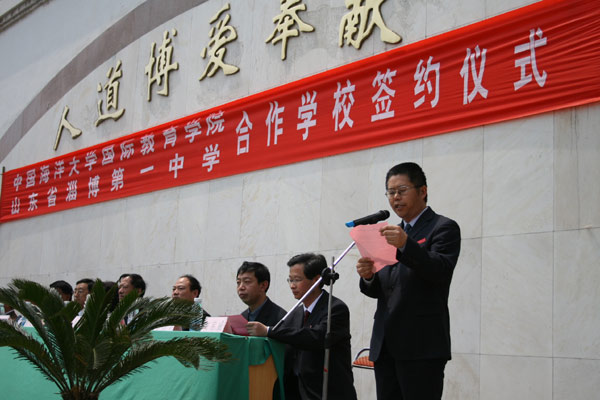 刘英学副书记作重要讲话,代表市教育局向中国海洋大学国际教育学院合作学校成功落户淄博一中表示祝贺。他指出,淄博一中领导视野开阔,决策超前,国际教育交流与合作工作走在了全市前列,这次与中国海洋大学国际教育学院的合作是优势互补、强强合作,必将进一步拓宽学生出国留学的渠道,满足更多学生走出国门、选择更多国家的需要。这是淄博一中学生的福音,也是淄博、博山孩子的福音。
