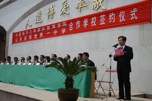 党委书记司志宏致辞,他首先代表学校党政领导班子、全校师生向中国海洋大学国际教育学院徐家海院长、吴立群书记、市人大常委会王世庆主任以及为合作学校牵线搭桥的我校顾问、区政协原副主席岳永禧等领导表示热烈的欢迎和衷心的感谢,他指出,我校将在中国海洋大学国际教育学院的帮助下,在原有的中英、中日、中韩联程高中班的基础上,建立中美、中德联程高中项目,开设德语、韩语等小语种,有针对性开展出国留学培训,节省学生学习的时间和经费,无需中介操作,走出一条安全、便捷、畅通的出国留学之路。