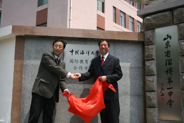 吴立群书记(左)与陈贞凯校长共同为“中国海洋大学国际教育学院合作学校”揭牌