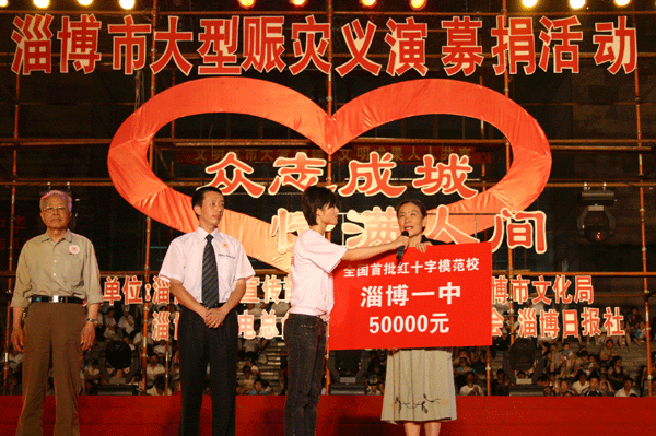 心系灾区 情助危难 日期:2008-05-26 来源:本站 X 众志成城 情暖人间——淄博市大型赈灾义演募捐活动于5月25日晚在淄博市博物馆广场举行。本次赈灾义演募捐活动,由淄博市委宣传部、淄博市民政局、淄博市文化局、淄博市广电总台(局)、淄博市红十字会、淄博日报社联合主办。我校作为全国首批红十字模范校,校长陈贞凯,全国优秀教师、山东省师德标兵贾爱华应邀参加。贾爱华老师代表学校现场再次捐款五万元,同时个人捐款壹万元。 贾爱华老师接受记者现场采访,代表学校及广大师生员工,表达了对汶川等地震灾区人民的衷心惦念和慰问,祝愿受灾人民早日重建家园,过上安宁幸福的生活。 截至此次捐款活动,淄博一中已先后集中进行了四次捐款,累计捐款共三十万元。 (学校办公室) 贾爱华老师在晚会现场接受记者采访