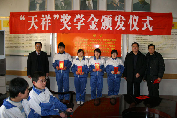 2009年1月16日,我校举行第四届“天祥奖学金”颁发仪式,学校爱心联谊会名誉会长、原博山区检察院逯检察长,博山天威集团天祥公司赵经理、袁经理,学校党委书记司志宏老师、学校副校长胡波老师、教务处主任李健老师参加,教育处主任张光努老师主持。