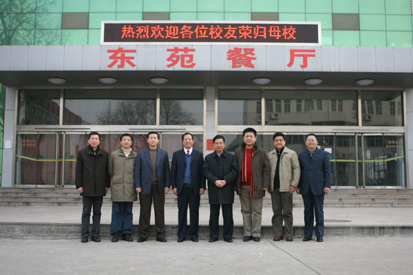 欢迎校友归来。校友孙照华(右四),现任国家外国专家局副局长;校友刘俭朴(左三),现任山东省政府副秘书长;校友雷岩(右三),著名男中音歌唱家,国家一级演员,山东省青年联合会副主席;校友张澎生(左二),现任淄博高新区管委会办公室副主任;校友张大庆(右二),山东师范大学音乐学院党委副书记。