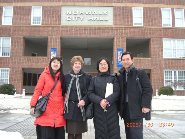 代表团在诺沃克访问期间,受到了麦克曼高中国际交流中心(CGS)全体师生及家长的热烈欢迎和热情接待。CGS中心主任麦卡茜夫人接见了代表团全体成员,与每位成员合影留念,并颁发了荣誉证书。麦卡茜夫人和校长助理李诚分别在欢迎仪式上致辞,并代表学校交换了纪念品。诺沃克市教育局长在市政厅办公室亲自接见了学校领导,并就进一步开展交流互访活动进行了深入的探讨,达成了一致的意见。