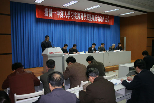 会议由陈贞凯校长主持,副校长张业玉宣读《中共淄博一中委员会关于开展深入学习实践科学发展观活动的实施方案》,纪委书记刘诚宣读《中共淄博一中委员会关于成立深入学习实践科学发展观活动领导小组、办公室及职能小组的通知》,工会主席孙希刚宣读《淄博一中深入学习实践科学发展观活动宣传方案》。