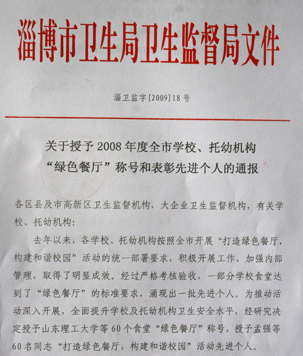 2008年以来,我校按照市卫生局卫生监督局在全市开展的“打造绿色餐厅,构建和谐校园”活动的统一部署,积级开展工作,根据要求增添了必备的硬件设施,在同学们中开展营养配餐工作,餐厅工作质量和服务水平取得了明显的提高,卫生安全管理措施和服务水平得到明显提升。在选活动中,我校东苑餐厅和西苑餐厅双双荣获“绿色餐厅”称号,赵博同志被授予“打造绿色餐厅,构建和谐校园”工作先进个人。