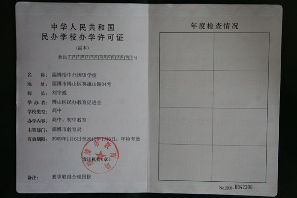 近日,淄博怡中外国语学校收到市教育局颁发的《中华人民共和国民办学校办学许可证》,有效期限为2009年1月6日至2017年1月6日。淄博怡中外国语学校1999年8月由博山区社会力量办学管理办公室批准办学,2000年、2003年分别由市、区社会力量办学管理办公室颁发初中、高中办学许可证。2004年9月经过审核,市教育局重新颁发办学许可证,有效期至2008年。2008年年底,市教育局年检审核,该校再次获得办学许可,并于近期收到办学许可证正、副本。