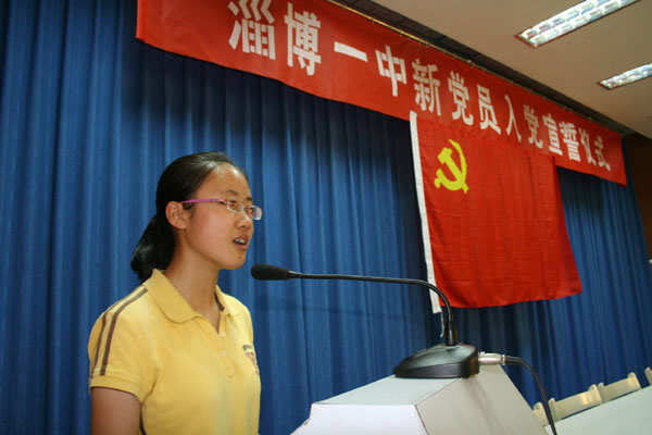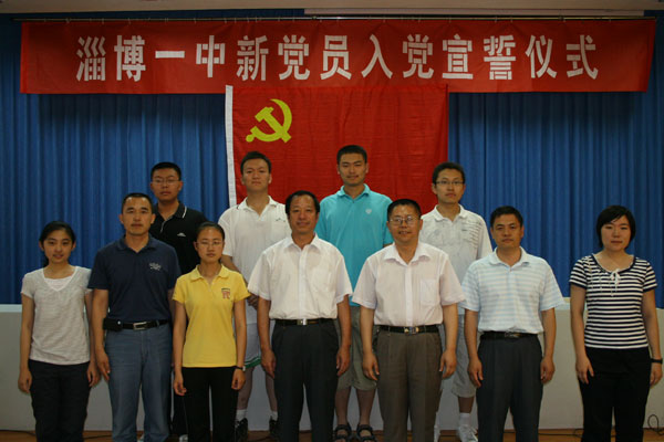 宣誓仪式在雄壮的《国际歌》声中开始,7名新党员面向党旗进行了庄严宣誓。团委书记梁慎超、新党员代表蒋楠、入党积极分子代表徐姮先后发言。党委书记司志宏在讲话中勉励大家要时刻牢记“今天你以淄博一中为荣,明天淄博一中以你为荣”的信念,勤奋学习,勇于实践,早日成才,为母校争光,为党旗添采!校长陈贞凯出席仪式并与大家合影留念。