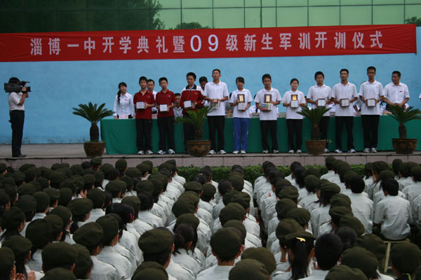 首先,由胡波副校长宣读《淄博一中关于表彰2008-2009学年度学校“四有”标兵暨首届“十佳”中学生的决定》,学校领导班子成员向10名“四有”标兵称号获得者,高2008级、高2007级、外语学校各10名“十佳”中学生颁发了获奖证书和奖品,“四有”标兵代表谢楠同学作了表态发言。
