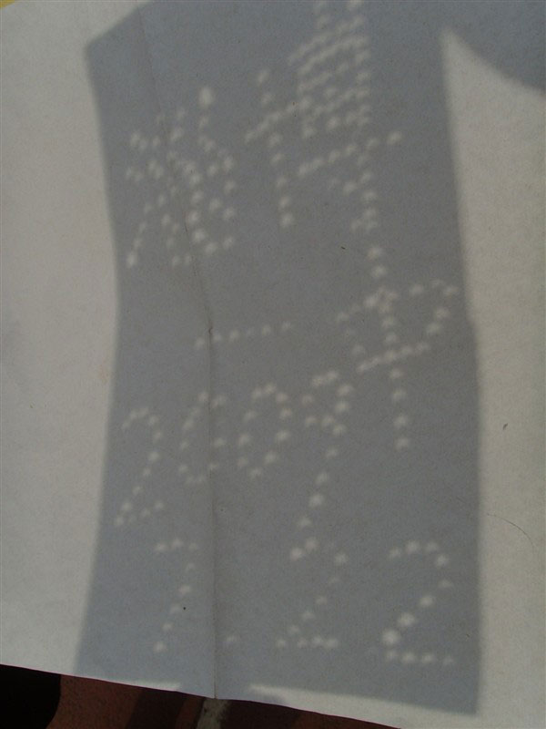 7月22日上午,高二天文小组同学到博山公园观测,由于天气晴朗,他们拍到了日偏食照片,进行了小孔成像实验,同时一边观测一边给周围群众讲解。以致把博山公园的一个跆拳道训练班吸引过来。他们观测得非常成功!