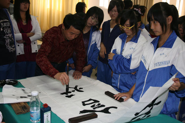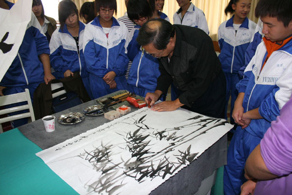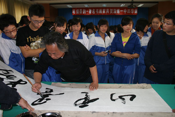 笔情墨韵——书画家光临我校,共贺85华诞 日期:2009-10-16 来源:本站 X 10月15日,我区14名国家、省、市级书协、画协的部分领导、书画家光临我校,共贺我校85周年华诞,挥毫泼墨与我校书法、绘画爱好者交流,并为我校留下了宝贵的作品。