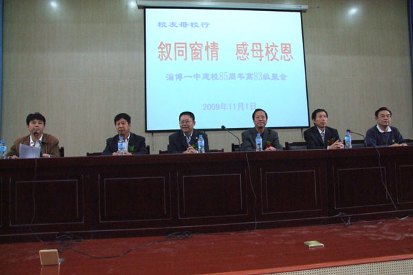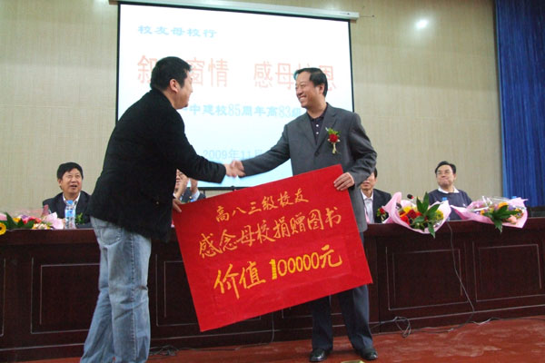 11月1日,在淄博一中85华诞喜庆气氛里,高八三级校友荣归母校欢聚一堂,畅叙同学之谊,共贺母校85载辉煌,祝福母校美好明天,并捐赠价值10万元图书,以表感恩母校之情。