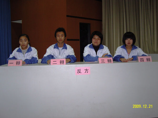 作为学校第二十一届艺术节重要项目之一的高2009级辩论会,于12月21日晚7点在信息图书楼科技报告厅举行,正反辩方以“合作与竞争谁更能促进中学生发展”为辩题进行了一场激动人心的辩论。两队辩手旁征博引,引经据典,你争我辩,妙语横生。特别是在当前学校进行新一轮课堂改革的影响下,双方辩手能够将小组合作学习模式渗透到辩论之中可谓是一大亮点。整场比赛高潮迭起,精彩纷呈,集思想性、逻辑性、明辩性、前瞻性于一体,吸引了众多同学的热情参与和阵阵掌声。尤其在观众互动环节,现场的同学们积极发言,场内气氛十分热烈,辩手敏锐的洞察力和逻辑清晰的雄辩将辩论赛推向高潮。