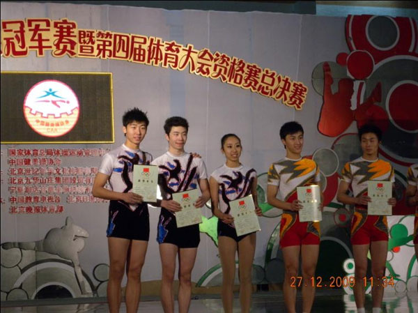 2009年全国健美操冠军赛于12月23日至12月28日在北京举行。此次比赛是全国健美操最高级别的比赛。我校高三学生岳士杰,孙诗阳,张玉滢,李凤琦,耿雪5名同学参加了本次比赛。在学校领导的关心和各级同仁的支持下,我校5名同学分别获得成人院校组三人操第二名、男子单人操第四名、六人操第四名的优异成绩,并全部达到了国家一级运动员标准(教育部规定:一级运动员可以享受高考文化课和专业课双免的政策)。同时周海霞老师被授予全国优秀教练员称号。健美操队将以此为起点再接再厉,为学校争得更多、更高荣誉。